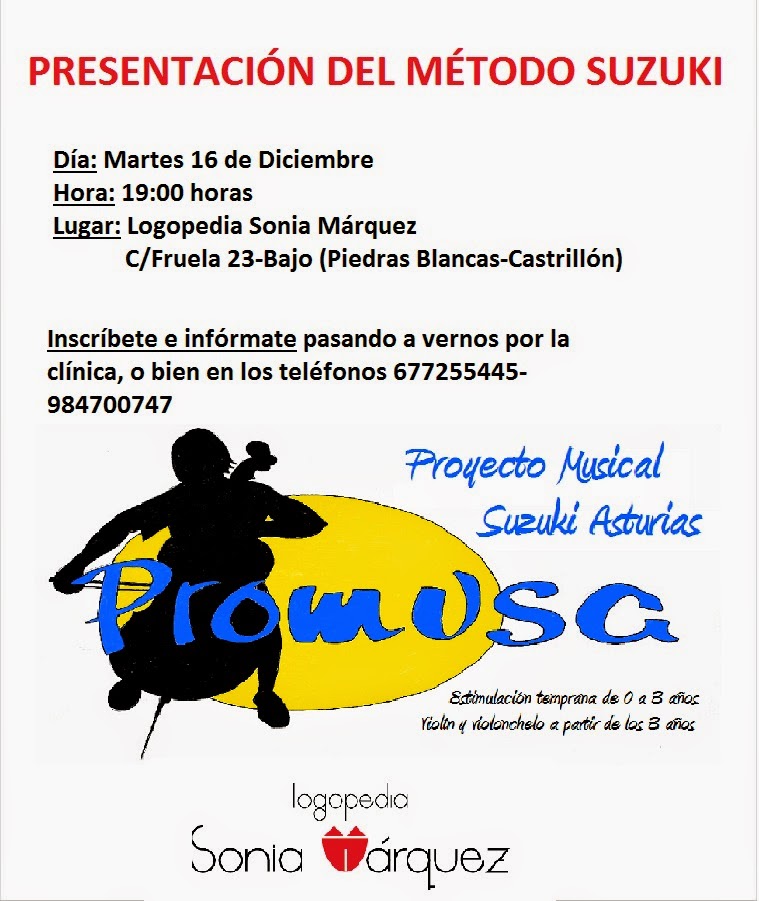 A partir de Enero del 2015, Logopedia Sonia Márquez incorpora a su clínica formado por un gran equipo de profesionales, el Método Suzuki, el cuál ya se imparte en Oviedo y Gijón, pero han decidido ampliar campo a la zona de Castrillón, Avilés, etc. y han elegido mi centro para llevarlo a cabo.